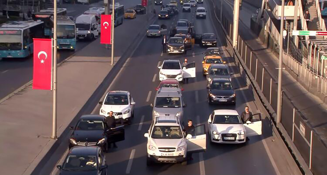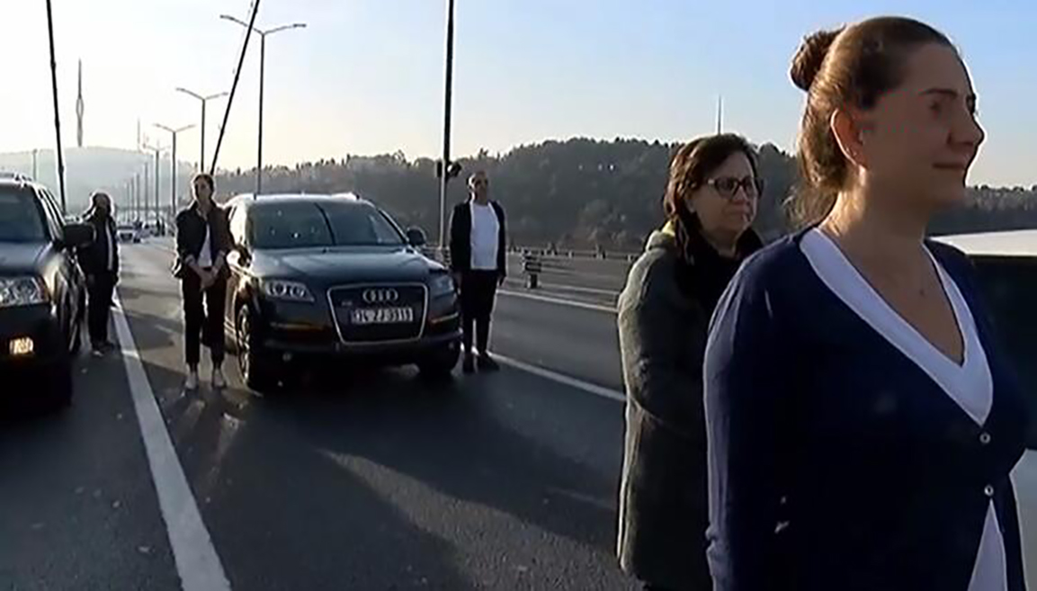 Atatürk'ün hayatını kaybettiği saat olan 09:05'te 15 Temmuz Şehitler Köprüsü'nde olanlar araçlarını durdurup inerek bir dakikalık saygı duruşunda bulundu.[/caption]