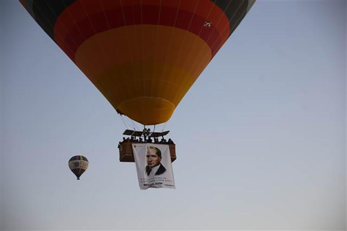 Kapadokya'da sıcak hava balonları, 10 Kasım Atatürk'ü Anma Günü dolayısıyla Türk bayrakları ve Atatürk afişleriyle uçtu.[/caption]
