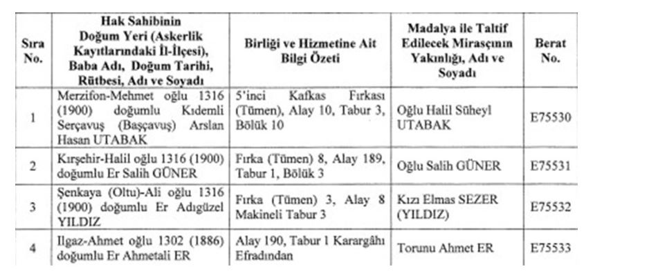 Kararda, "Kurtuluş Savaşındaki hizmetleri tespit edilen ve ekli listede adları yazılı gazilerin aynı listede belirtilen mirasçılarına 'İstiklal Madalyası' verilmesine 66 sayılı İstiklal Madalyası Kanununun ek 4. ve 6. maddeleri gereğince karar verilmiştir." ifadeleri yer aldı.Karara göre, İstiklal Madalyası verilecek gaziler ile mirasçılarının isimleri şöyle: