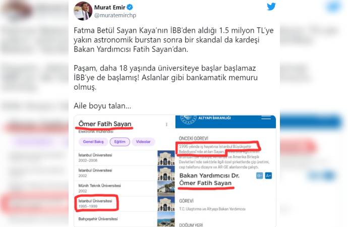 Emir Twitter hesabından yaptığı paylaşımda, "Fatma Betül Sayan Kaya’nın İBB’den aldığı 1.5 milyon TL’ye yakın astronomik burstan sonra bir skandal da kardeşi Bakan Yardımcısı Fatih Sayan’dan. Paşam, daha 18 yaşında üniversiteye başlar başlamaz İBB’ye de başlamış! Aslanlar gibi bankamatik memuru olmuş. Aile boyu talan…" ifadesini kullandı.