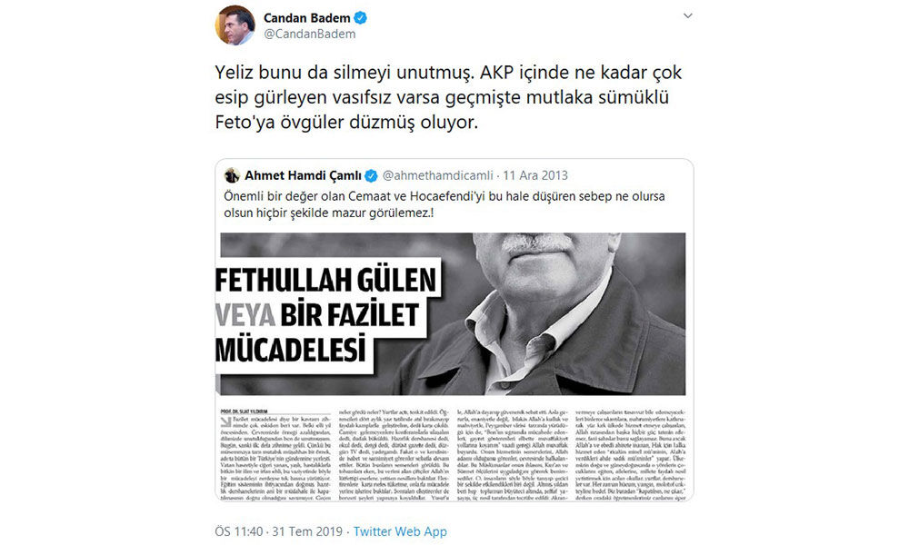 Önemli bir değer olan Cemaat ve Hocaefendi'yi bu hale düşüren sebep ne olursa olsun hiçbir şekilde mazur görülemez.!” diye yazmış olan AKP’li vekil Çamlı, FETÖ’nün kapatılan yayın organı Zaman gazetesindeki Suat Yıldız’ın yazısını paylaşmıştı.
