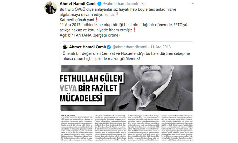 Tüm bunlara karşın, Ahmet Hamdi Çamlı’nın 2013 yılının Aralık ayından FETÖ lideri Fethullah Gülen’den övgüyle söz ettiği mesajını bugün dahi savunması şaşırttı.