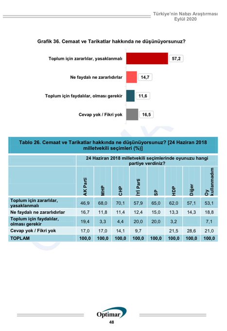 AKP’ye yakınlığı ile bilinen OPTİMAR'ın her ay yaptığı "Türkiye'nin Nabzı" araştırmasına göre toplumun çoğunluğu cemaat ve tarikatların zararlı olduğunu ve yasaklanması gerektiği görüşünde.