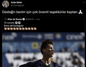 Sosyal medya hesabından bir paylaşım yapan Alex de Souza "10 numara... Bravo Arda Güler" ifadelerini kullanırken alkış emojisi ekledi. Arda Güler ise Alex'in paylaşımını alıntılayarak "Desteğin benim için çok önemli teşekkürler kaptan" yanıtını verdi.