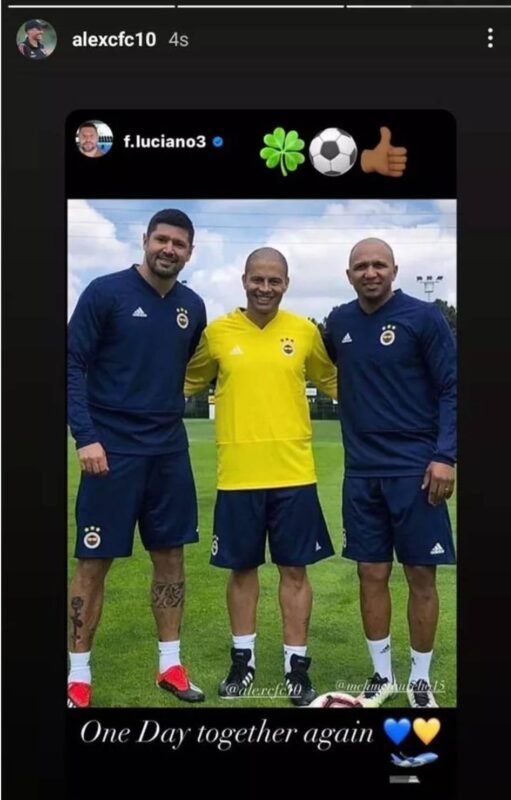 Sarı-Lacivertli ekibin eski futbolcularından Fabio Luciano'nun, Mehmet Aurelio ve Alex'in bulunduğu "Bir gün yeniden birlikte" şeklindeki paylaşımını, kendi sosyal medya hesabından takipçilerine aktaran Alex, Fenerbahçe taraftarlarını heyecanlandırdı.