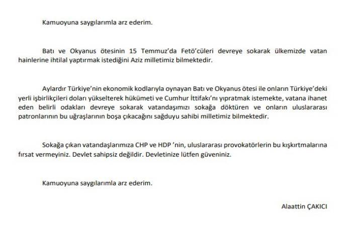 Suç örgütü lideri Alaattin Çakıcı, dün 'aşırı oynak' piyasanın hareketliliğinden sonra insanların sokaklara çıkmasıyla ilgili uyarı yaptı. Dış güçlerin ihtilal yaptırmak istediğini belirten çakıcı 'kışkırtmalara gelmeyin' dedi.