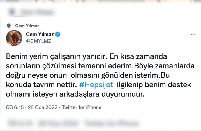 Komedyen Cem Yılmaz, Hepsijet işçilerine kişisel Twitter hesabı üzerinden destek verdi. Yılmaz, "Benim yerim çalışanın yanıdır" ifadelerini kullandı.