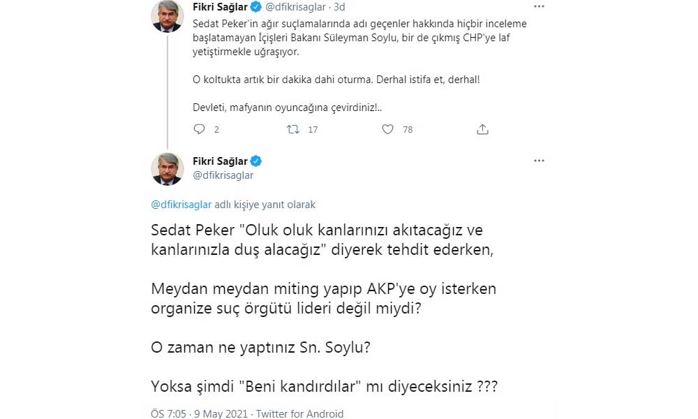 Organize suç örgütü lideri Sedat Peker'in AKP için oy istediği mitingleri hatırlatan CHP'li Fikri Sağlar'ın sosyal medya hesabından yaptığı açıklama şöyle: "Sedat Peker'in ağır suçlamalarında adı geçenler hakkında hiçbir inceleme başlatamayan İçişleri Bakanı Süleyman Soylu, bir de çıkmış CHP'ye laf yetiştirmekle uğraşıyor. O koltukta artık bir dakika dahi oturma. Derhal istifa et, derhal! Devleti, mafyanın oyuncağına çevirdiniz!.. Sedat Peker "Oluk oluk kanlarınızı akıtacağız ve kanlarınızla duş alacağız" diyerek tehdit ederken, Meydan meydan miting yapıp AKP'ye oy isterken organize suç örgütü lideri değil miydi? https://tele1.com.tr/sedat-pekerden-ucuncu-video-kaburgalarini-kirdim-ama-yetmedi-387535/ O zaman ne yaptınız Sn. Soylu? Yoksa şimdi "Beni kandırdılar" mı diyeceksiniz ???"