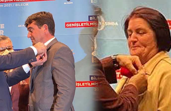 CHP'den istifa edip AKP'ye transfer olan Şerafettin Turan ve Özden Karip'in rozetlerini İl Başkanı Serkan Yıldırım ve Bilecik Milletvekili Selim Yağcı taktı.[/caption]