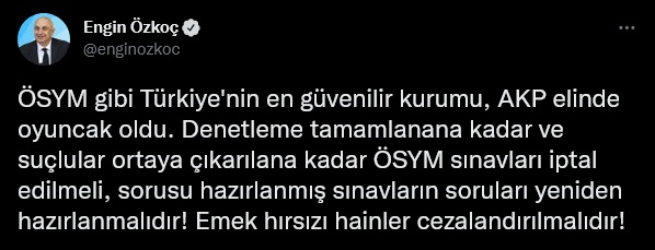 CHP Grup Başkanvekili Engin Özkoç, Twitter hesabından KPSS sorularının çalındığı iddiasına tepki gösterdi. Engin Özkoç, AKP iktidarında Türkiye'nin en güvenilir kurumlarından biri olan ÖSYM'nin 'oyuncak' olduğunu savundu. Özkoç, denetlemenin tamamlanarak suçluların ortaya çıkarılmasına kadar sınavların iptal edilmesi gerektiğini dile getirdi. Özkoç, "sorusu hazırlanmış sınavların soruları yeniden hazırlanmalıdır! Emek hırsızı hainler cezalandırılmalıdır!" dedi. Özkoç'un paylaşımı şöyle: "ÖSYM gibi Türkiye'nin en güvenilir kurumu, AKP elinde oyuncak oldu. Denetleme tamamlanana kadar ve suçlular ortaya çıkarılana kadar ÖSYM sınavları iptal edilmeli, sorusu hazırlanmış sınavların soruları yeniden hazırlanmalıdır! Emek hırsızı hainler cezalandırılmalıdır!" https://tele1.com.tr/feto-gitti-uygulamalari-devam-ediyor-kpssde-sorular-verildi-iddiasi-671598/