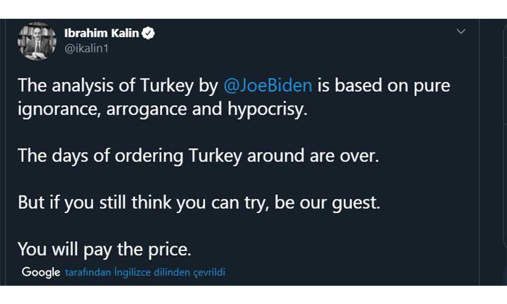 https://tele1.com.tr/erdoganin-ekmegine-aylar-sonra-servis-edilip-surulen-joe-biden-yagi-204925/ İbrahim Kalın, İngilizce yaptığı paylaşımda, “Biden'ın Türkiye analizi saf bir kibir ve ikiyüzlülüğe dayanıyor. Türkiye'ye emir verilen günler geride kaldı deneyebileceğini düşünüyorsa bedelini öder” ifadelerini kullandı. https://tele1.com.tr/gozler-fahrettin-altunda-8-ay-onceki-haberi-bugun-mu-ogrendi-204959/