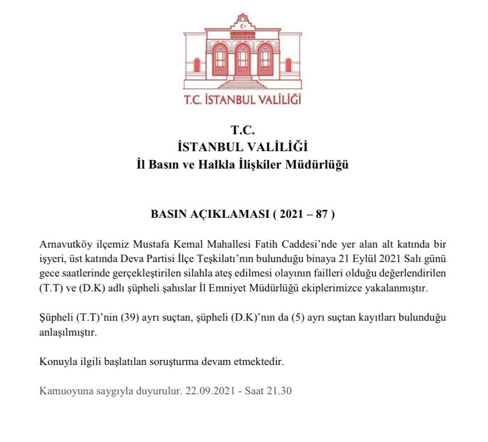 Demokrasi ve Atılım (DEVA) Partisi Arnavutköy İlçe Başkanlığı’na dün silahla 7 el ateş edildi. İstanbul Valiliği bugün yaptığı açıklamada 2 saldırganın yakalandığın duyurdu. Valilikten yapılan açıklamada şu ifadelere yer verildi. " Arnavutköy ilçemiz Mustafa Kemal Mahallesi Fatih Caddesi’nde yer alan alt katında bir işyeri, üst katında Deva Partisi İlçe Teşkilatı’nın bulunduğu binaya 21 Eylül 2021 Salı günü gece saatlerinde gerçekleştirilen silahla ateş edilmesi olayının failleri olduğu değerlendirilen (T.T) ve (D.K) adlı şüpheli şahıslar İl Emniyet Müdürlüğü ekiplerimizce yakalanmıştır. Şüpheli (T.T)’nin (39) ayrı suçtan, şüpheli (D.K)’nın da (5) ayrı suçtan kayıtları bulunduğu anlaşılmıştır. Konuyla ilgili başlatılan soruşturma devam etmektedir."
