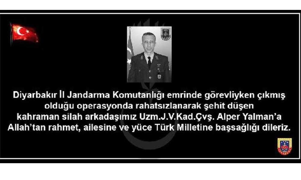 Jandarma Genel Komutanlığı, Diyarbakır'da operasyon sırasında rahatsızlanan Uzman Jandarma Çavuş Alper Yalman'ın şehit olduğunu duyurdu.
