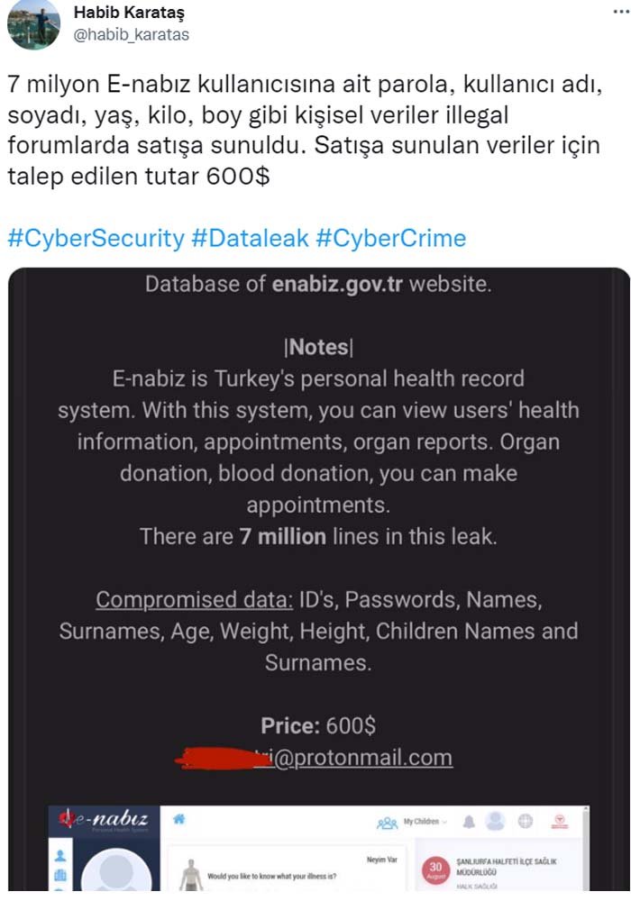 Sağlık platform ve uygulamalarından biri olan e-Nabız'ın hacklendiği iddia edildi. Aynı zamanda kullanıcılar hack sitelerine satıldığını da iddia etti. 7 milyon kişiye ait olduğu iddia edilen veriler şu şekilde: Kimlik bilgileri, şifreleri, yaşı, kilosu, (Varsa) çocuklarının isimleri Peki gerçekten e-Nabız uygulama verileri ele mi geçirildi? Sağlık Bakanlığı tarafından henüz e-Nabız'ın hacklendiği iddialarına ilişkin henüz açıklama yapılmadı.SOSYAL MEDYADA TEPKİ YAĞDI