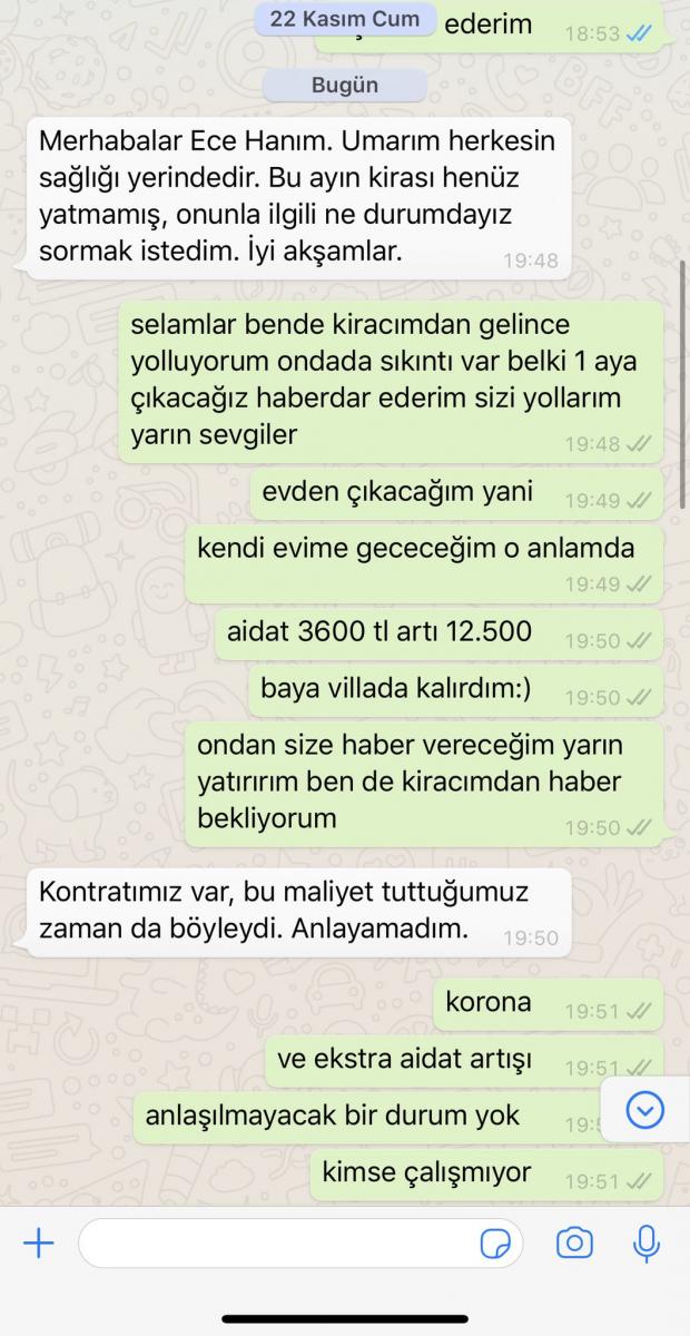 Sunucu Ece Erken, kirayı isteyen ev sahibiyle yaptığı konuşmayı sosyal medya hesabından paylaşarak "Aidat 3600 TL artı kira 12.500 TL, bu paraya villada kalırdım. Sonuçta korona var, kimse çalışmıyor" dedi.