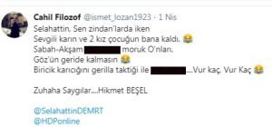 Öte yandan, yine Hikmet Oğuz Beşel'e ait olduğu iddia edilen hesaplardan birinde de Selahattin Demirtaş ve ailesinin hedef alındığı ortaya çıktı. "Cahil filozof" isimli twitter hesabından yapılan çirkin paylaşımın altında "Hikmet Beşel" imzası yer alırken, Demirtaş ve ailesine yönelik de hakaret edildiği görüldü.