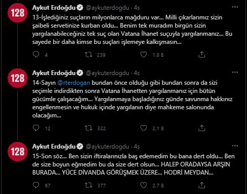 Sayın Recep Tayyip Erdoğan kurduğunuz suç örgütünün aparatlarıyla uğraşmanın faydası yok… Gerçeği saklamanın da bir faydası da yok… Siz milyonlarca insanı mağdur eden ve vicdanın kırıntısı bile olmayan bu canavar düzenin kurucusunuz… Siz bu suç örgütünün bir numarasısınız… İşlediğiniz suçların milyonlarca mağduru var… Milli çıkarlarımız sizin şaibeli servetinize kurban oldu… Benim tek muradım birgün sizin yargılanabileceğiniz tek suç olan Vatana ihanet suçuyla yargılanmanız… Bu sayede bir daha kimse bu suçları işlemeye kalkışmasın… Sayın Recep Tayyip Erdoğan bundan önce olduğu gibi bundan sonra da sizi seçimle indirdikten sonra Vatana İhanetten yargılanmanız için bütün gücümle çalışacağım… Yargılanmaya başladığınız günde savunma hakkınız engellenmesin ve hukuk içinde yargılanın diye mahkeme salonunda olacağım… Son söz… Ben sizin iftiralarınızla baş edemedim bu bana dert oldu… Ben de size boyun eğmedim bu da size dert olsun… HALEP ORADAYSA ARŞIN BURADA… YÜCE DİVANDA GÖRÜŞMEK ÜZERE… HODRİ MEYDAN…" İşte o paylaşımlar;