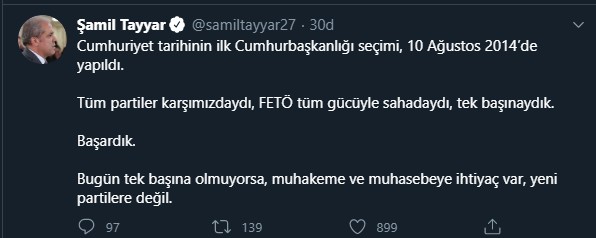 Eski AKP'li Şamil Tayyar, kişisel Twitter hesabından yaptığı paylaşımda şu ifadelere yer verdi: "Cumhuriyet tarihinin ilk Cumhurbaşkanlığı seçimi, 10 Ağustos 2014’de yapıldı. Tüm partiler karşımızdaydı, FETÖ tüm gücüyle sahadaydı, tek başınaydık. Başardık. Bugün tek başına olmuyorsa, muhakeme ve muhasebeye ihtiyaç var, yeni partilere değil."