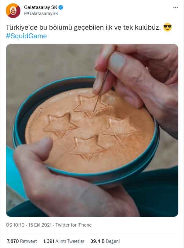 Galatasaray, son günlerin popüler dizi serisi Squid Game temalı bir paylaşım yaptı. Sarı-kırmızılılar, Beşiktaş'ın Medipol Başakşehir'e 3-2 mağlup olduğu maçın ardından yaptığı paylaşımda "Türkiye'de bu bölümü geçebilen ilk ve tek kulübüz" ifadelerini kullandı. Son günlerin fenomeni Güney Kore yapımı dizide ödüle ulaşmak isteyen oyuncuların oynadığı bir çocuk oyunu, sosyal medyada adeta viral oldu. İşte Galatasaray'ın paylaşımı: