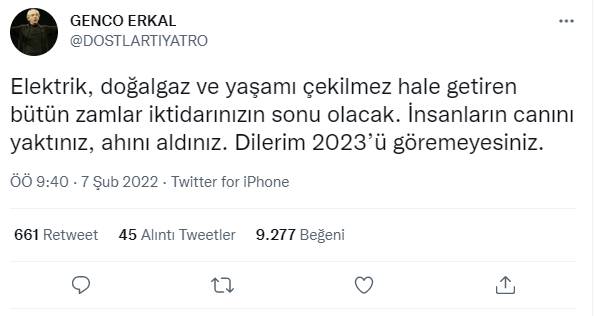 Sanatçı Genco Erkal, son zamanlarda artan zamlarla ilgili açıklamalarda bulundu. Vatandaşın belini büken zamlara isyan eden sanatçı Twitter hesabından şu paylaşımı yaptı: