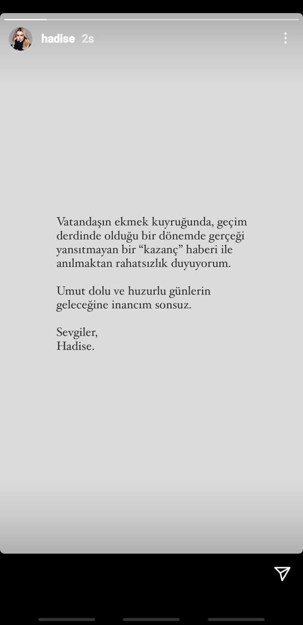 "Vatandaşın ekmek kuyruğunda, geçim derdinde olduğu bir dönemde gerçeği yansıtmayan bir "kazanç" haberi ile anılmaktan rahatsızlık duyuyorum. Umut dolu ve huzurlu günlerin geleceğine inancım sonsuz. Sevgiler."