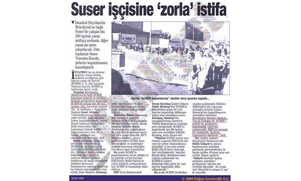 Erdoğan göreve geldikten 5 ay sonra İstanbul’da su faturaları dağıtımı, su sayaçlarını okuma, tankerle su dağıtma gibi işleri yapan Su Servisi A.Ş.’yi (SUSER) kapatma kararı aldı. Şirkette çalışan bin 200 işçi işsiz kaldı.