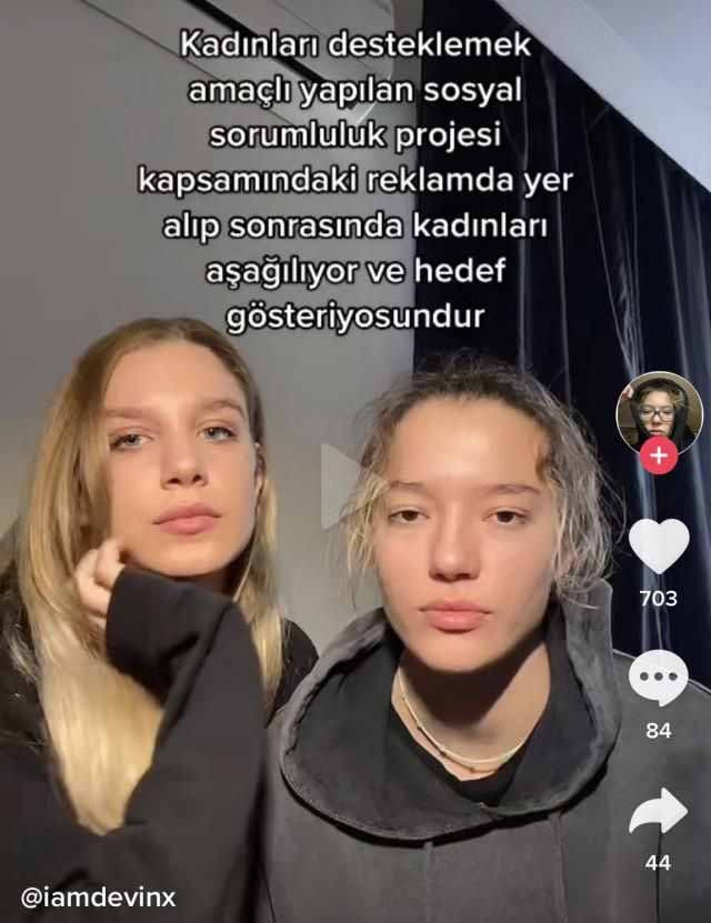 TikTok fenomeni Devin, sevgilisi İmge'yle bir paylaşım yapıp milli voleybolcu Ebrar Karakurt'un oynadığı reklam filmini ima ederek "Kadınları desteklemek amaçlı yapılan sosyal sorumluluk projesi kapsamındaki reklamda yer alıp sonrasında kadınları aşağılıyor ve hedef gösteriyor" şeklinde konuştu.