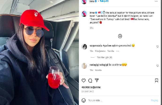 İstanbul’da çeşitli TV ve radyo programlarına katılması beklenen Inna’nın programı kar nedeniyle ileri bir tarihe ertelendi. Hava şartları nedeniyle Çorlu inmek zorunda kalan Inna, Instagram hesabında paylaştığı fotoğrafında "Bu fotoğrafta İstanbul'da olduğumu göstermeliydim. Ama olmadı. Türkiye'de bir yerde güvendeyim. Fakat yorgunum" dedi. https://tele1.com.tr/istanbulda-kamu-calisanlari-ve-ogrencilere-izin-551935/