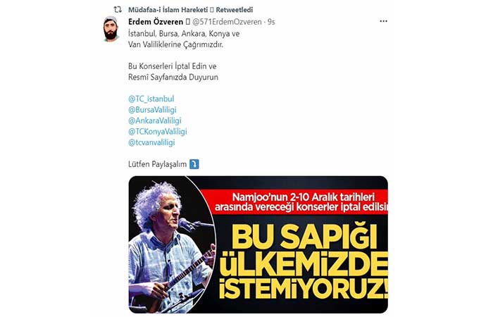 İslamcı grupların konser iptallerine ilişkin çağrılarına bir yenisi eklendi. Diyanet ve Vakıf Çalışanları Sendikası Genel Başkanı Mustafa Çopursuz ile Müdafaa-i İslam Hareketi adlı grup, İranlı müzisyen Mohsen Namjoo'nun Türkiye'de 2-10 Aralık tarihleri arasında Türkiye'de vermeyi planladığı beş