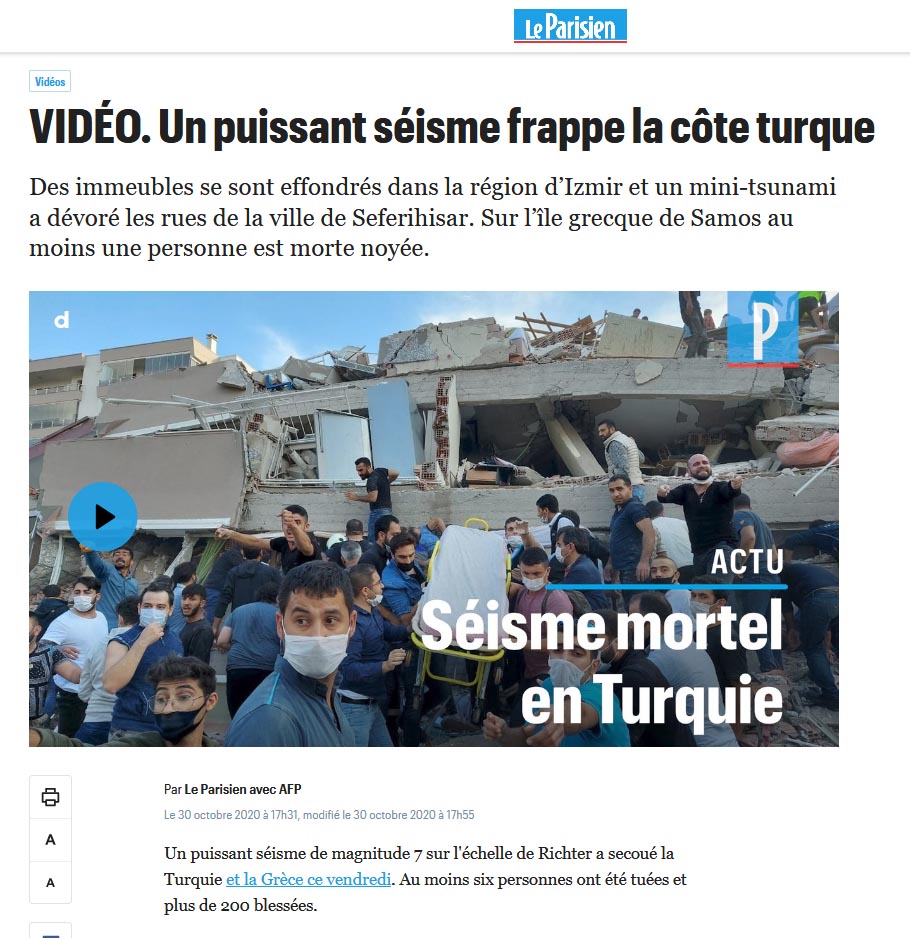 Depremin merkez üssü, İzmir ve Yunanistan’ın Samos adasının 16 kilometre kuzeyi. Video görüntüleri ve fotoğraflar, İzmir’de yıkılan binaları, toz bulutlarını ve yıkıntılardan kurtarma mücadelelerini gösteriyor. Sadece İzmir’de değil, Yunanistan’da da can kayıpları var” ifadelerine yer verdi.