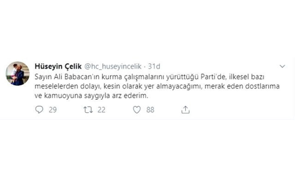 11. Cumhurbaşkanı Abdullah Gül öncülüğünde Ali Babacan tarafından kurulacak yeni parti yer alacağı konuşulan Hüseyin Çelik, sosyal medya hesabından açıklama yaptı."İLKESEL BAZI MESELELERDEN DOLAYI..."