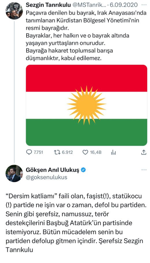 Gökşen Anıl Ulukuş, sosyal medya hesabından yaptığı paylaşımda, “Sezgin Tanrıkulu’na o konu başta olmak üzere pek çok konuda katılmıyorum. Ancak yazdığım ifadelerin dilinin doğru olmadığına karar verdim. Sezgin Tanrıkulu ile ilgili olan tweeti sildim” ifadelerine yer verdi. https://tele1.com.tr/eski-zafer-partili-ulukus-kilicdaroglunun-danismani-oldu-872301/ Ulukuş, söz konusu tweet'inde Tanrıkulu'na Irak Kürdistan Bölge Yönetimi bayrağıyla ilgili sözleri üzerine "şerefsiz", "namussuz", "terör destekçisi" gibi ağır hakaretler etmişti.