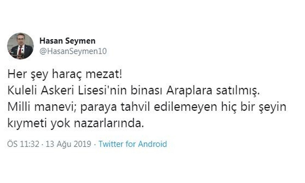 15 Temmuz FETÖ Darbe Girişimi'nin ardından kapatılan tarihi Kuleli Askeri Lisesi ile ilgili İYİ Parti Genel Başkan Yardımcısı Hasan Seymen'den flaş bir iddia geldi. Seymen, Twitter'dan yaptığı açıklamada, "Her şey haraç mezat! Kuleli Askeri Lisesi'nin binası Araplara satılmış. Milli manevi; paraya tahvil edilemeyen hiç bir şeyin kıymeti yok nazarlarında" ifadelerini kullandı.