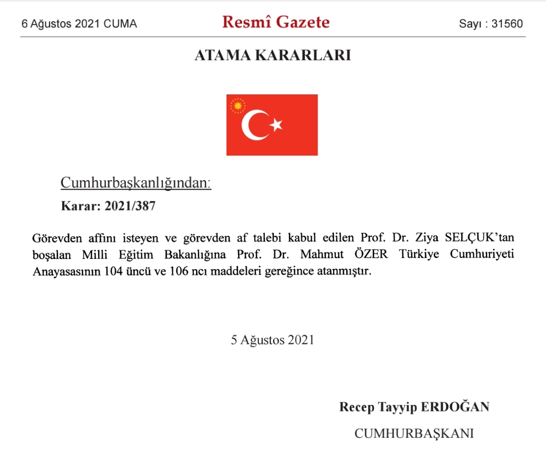 "Görevden affını isteyen ve görevden af talebi kabul edilen Prof. Dr. Ziya SELÇUK'tan boşalan Milli Eğitim Bakanlığına Prof. Dr. Mahmut ÖZER Türkiye Cumhuriyeti Anayasasının 104 üncü ve 106 ncı maddeleri gereğince atanmıştır."