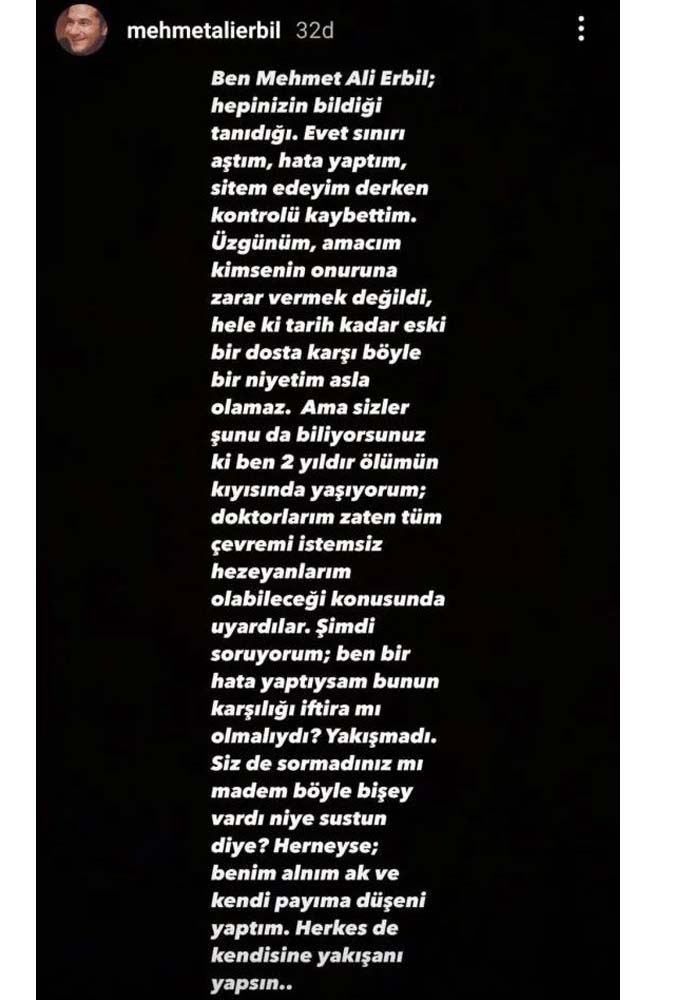 Ben Mehmet Ali Erbil; hepinizin bildiği tanıdığı. Evet sınırı aştım, hata yaptım, sitem edeyim derken kontrolü kaybettim. Üzgünüm, amacım kimsenin onuruna zarar vermek değildi, hele ki tarih kadar eski bir dosta karşı böyle bir niyetim asla olamaz.