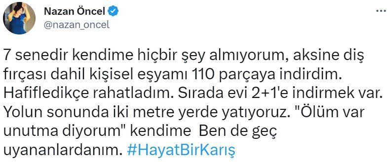 Sanatçı,Nazan Öncel kendisine ait sosyal medya hesabından “7 senedir kendime hiçbir şey almıyorum, aksine diş fırçası dahil kişisel eşyamı 110 parçaya indirdim. Hafifledikçe rahatladım. Sırada evi 2+1’e indirmek var. Yolun sonunda iki metre yerde yatıyoruz. ‘Ölüm var unutma diyorum’ kendime. Ben de geç uyananlardanım” ifadelerini kullandı https://tele1.com.tr/nazan-oncelden-erdoganin-surtuk-hakaretine-tepki-634802/