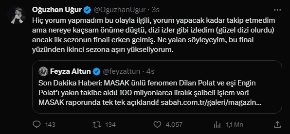 Mali Suçları Araştırma Kurulu'nun (MASAK) Dilan Polat ve eşi Engin Polat'ın 200 bin liralık sahte işlemini raporlaması ve savcılığa hesaplarının dondurulması önerisinin ardından Oğuzhan Uğur dikkat çeken bir paylaşımda bulundu. Uğur paylaşımında, "Dizi izler gibi izledim ancak ilk sezonun finali erken gelmiş" dedi.