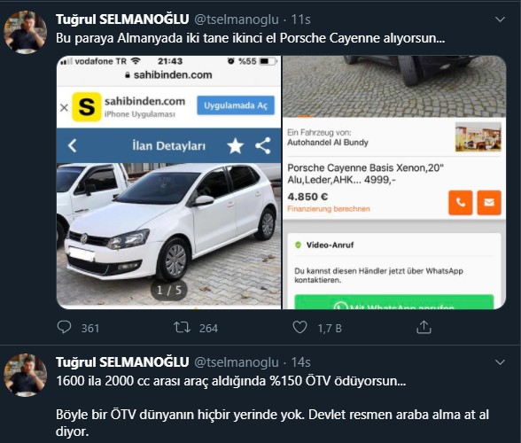 Selmanoğlu paylaşımında, “1600 ila 2000 CC arası araç aldığında yüzde 150 ÖTV ödüyorsun... Böyle bir ÖTV dünyanın hiçbir yerinde yok. Devlet resmen araba alma at al diyor” ifadelerini kullandı.