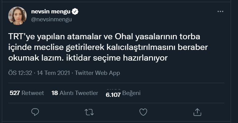 Gazeteci Nevşin Mengü de kendisine ait resmi sosyal medya hesabından "