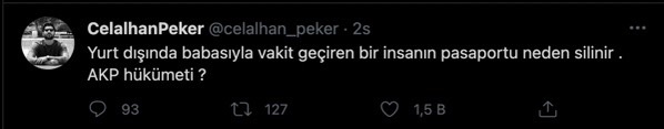 Celal Han Peker, sosyal medya hesabından yaptığı açıklamada, "Yurt dışında babasıyla vakit geçiren bir insanın pasaportu neden silinir . AKP hükümeti ?" ifadelerini kullandı.