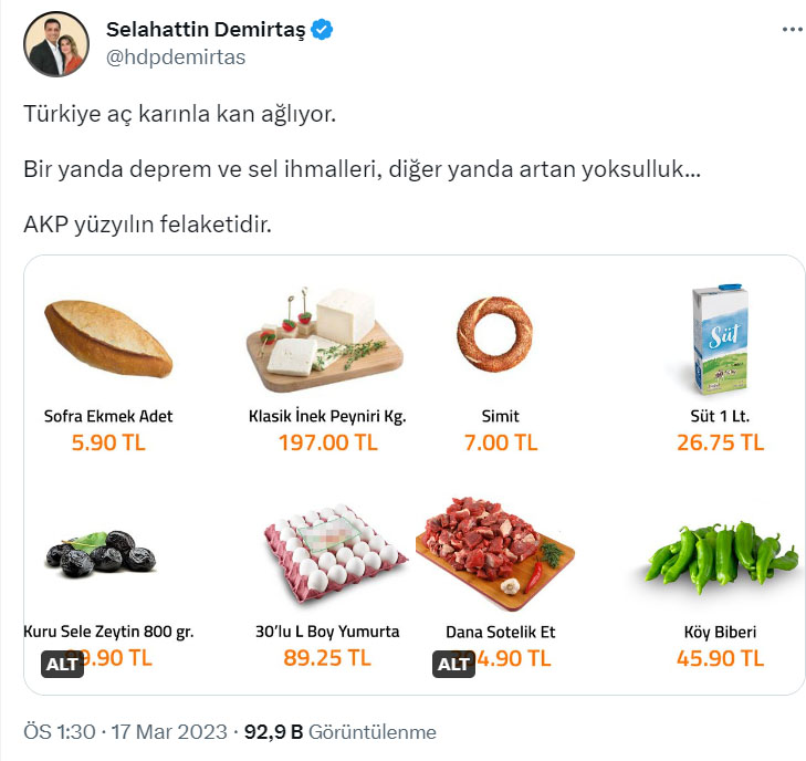 Türkiye'de yurttaşlar ekonomik krizin etkilerini her yerde hissederken yaşanan deprem ve sel felaketleri afetlere karşı ne kadar hazırlıksız olduğunu gözler önüne serdi. https://tele1.com.tr/selahattin-demirtas-hdp-kapilari-tumden-kapatmadi-768186/ Yaşanan sel ve deprem felaketlerinin yaraları halen sarılamamışken seçim gündemine giren Türkiye'de vatandaşın alım gücündeki düşüş devam ediyor. Yaşanan ekonomik krize tepki gösterenlerden biri de HDP'nin tutuklu bulunan eski Eş Genel Başkanı Selahattin Demirtaş oldu. Demirtaş sosyal medya hesabından yaptığı paylaşıma bir fiyat listesi ekledi ve şunları söyledi: "Türkiye aç karınla kan ağlıyor. Bir yanda deprem ve sel ihmalleri, diğer yanda artan yoksulluk... AKP yüzyılın felaketidir."