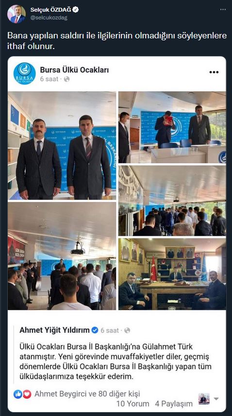 İl Başkanlığının sosyal medya hesabından yapılan açıklamada, “Ülkü Ocakları Bursa İl Başkanlığı’na Gülahmet Türk atanmıştır. Yeni görevinde muvaffakiyetler diler, geçmiş dönemlerde Ülkü Ocakları Bursa İl Başkanlığı yapan tüm ülküdaşlarımıza teşekkür ederim” ifadeleri kullanıldı. Bu karara tepki gösteren Selçuk Özdağ, sosyal medya hesabından “Bana yapılan saldırı ile ilgilerinin olmadığını söyleyenlere ithaf olunur” diye yazarak Ülkü Ocaklarının açıklamasını paylaştı. İşte o paylaşım: