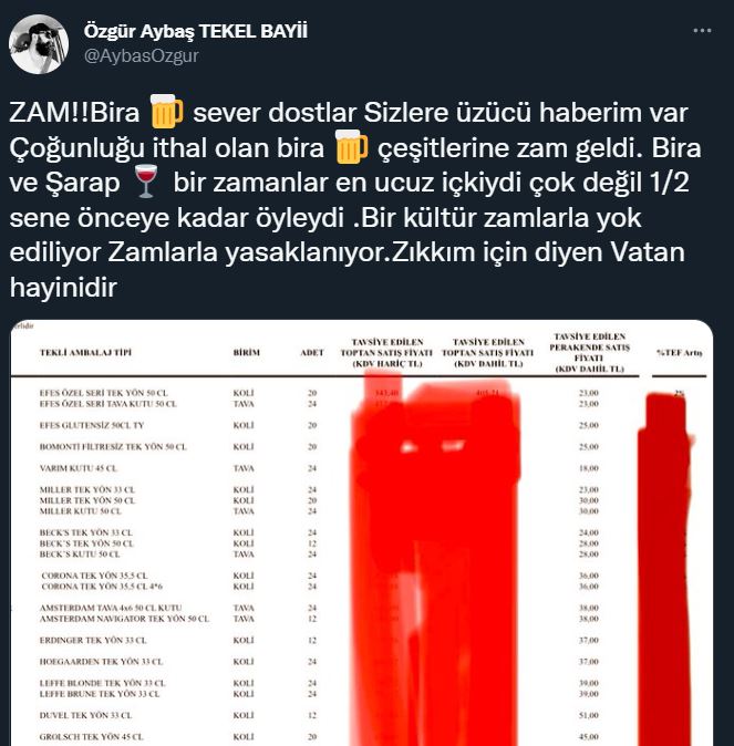 Tekel Bayileri Platformu (TBP) Başkanı Özgür Aybaş, biraya zam geldiğini duyurdu. Sosyal medya hesabından zam listesini paylaşan Aybaş, "ZAM!!Bira sever dostlar Sizlere üzücü haberim var Çoğunluğu ithal olan bira çeşitlerine zam geldi. Bira ve Şarap bir zamanlar en ucuz içkiydi çok değil 1/2 sene önceye kadar öyleydi .Bir kültür zamlarla yok ediliyor Zamlarla yasaklanıyor. Zıkkım için diyen Vatan hayinidir" dedi. https://tele1.com.tr/alkol-ve-sigaraya-zam-geliyor-589502/
