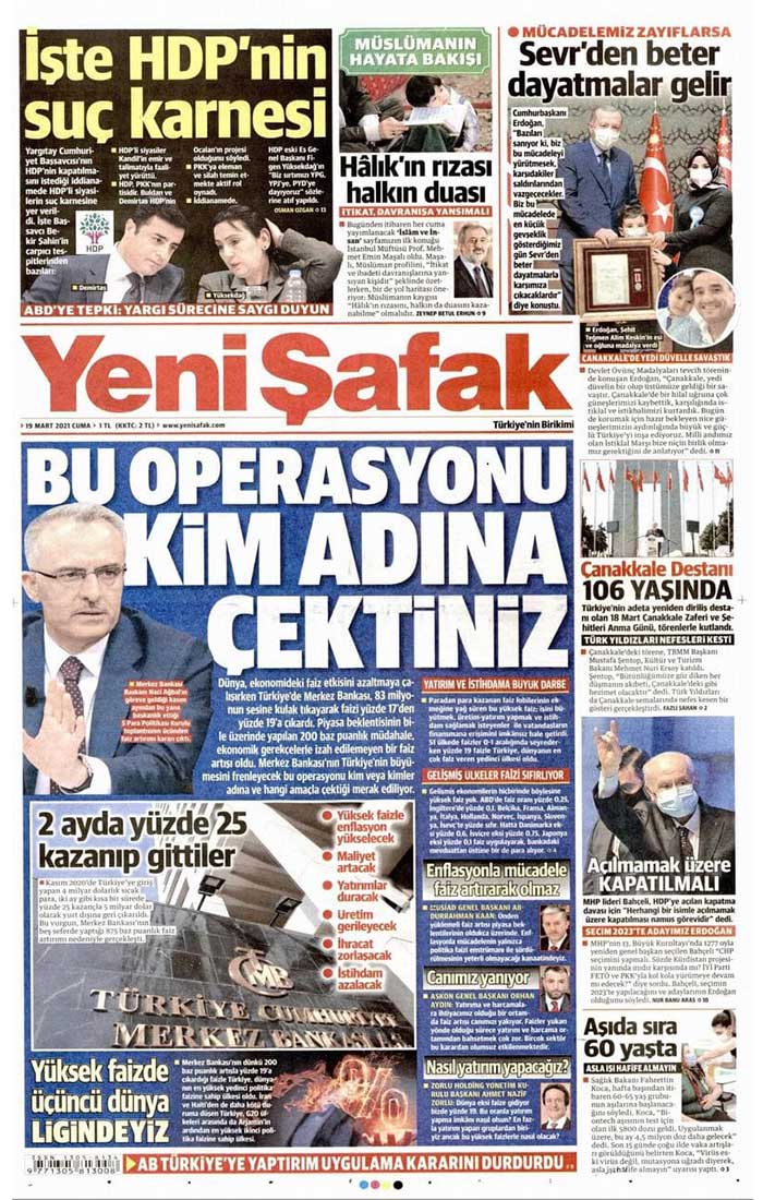 Yandaş Yeni Şafak gazetesi Merkez Bankası'nın aldığı 200 baz puanlık faiz artışı kararına tepki göstererek söz konusu haberi manşete taşıdı. Yeni Şafak, söz konusu haberi, "Bu operasyonu kim adına çektiniz" diyerek duyurdu. Yeni Şafak haberin devamında "Dünya, ekonomideki faiz etkisini azaltmaya çalışırken Türkiye’de Merkez Bankası, 83 milyonun sesine kulak tıkayarak faizi yüzde 17’den yüzde 19’a çıkardı. Piyasa beklentisinin bile üzerinde yapılan 200 baz puanlık müdahale, ekonomik gerekçelerle izah edilemeyen bir faiz artışı oldu. Merkez Bankası’nın Türkiye’nin büyümesini frenleyecek bu operasyonu kim veya kimler adına ve hangi amaçla çektiği merak ediliyor." ifadelerini kullandı.