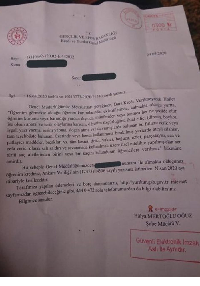 Anka Haber Ajansı’nın haberine göre, öğrenciye iletilen tebligatta ”öğrenim hakkını engelleyici eyleme” katıldığı ifade edilirken, ”Öğrenim krediniz Ankara Valiliği’nin yazısına istinaden Nisan ayı itibarıyla kesilecektir” denildi.