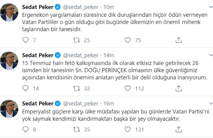 Vatan Partisi’ne ilişkin “ülkemizin en önemli mihenk taşlarından bir tanesidir” ifadesini kullanan Peker’in Twitter hesabından şu mesajlar yayımlandı: