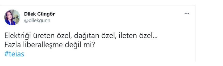 Sabah gazetesi yazarı Dilek Güngör, tartışma yaratan son zammın ardından dikkat çeken bir mesaj yayımladı. Dilek Güngör, “Elektriği üreten özel, dağıtan özel, ileten özel... Fazla liberalleşme değil mi?” diye sordu.