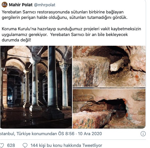 Yerebatan Sarnıcı'nın ziyarete kapalı bölümünde yaklaşık 4 yıldır devam eden restorasyon çalışmaları sırasında Cumhuriyet geç dönem restorasyonunda yapılan gergi elamanlarının, sütün başlarında son bulduğu ve devamlılık oluşturmadığı tespit edildi. Bu durum, olası depremde Sarnıç'ta ciddi hasarların oluşabileceğini, hatta göçmelerin bile yaşanabileceğini gösteriyor. Sadece sarnıç değil çevresindeki yapılar da tehdit alında. İBB Genel Sekreter Yardımcısı Mahir Polat, mevcut tehlikeyle ilgili olarak, "Yerebatan Sarnıcı restorasyonunda sütunları birbirine bağlayan gergilerin perişan halde olduğunu, sütunları tutamadığını gördük. Koruma Kurulu’na hazırlayıp sunduğumuz projeleri vakit kaybetmeksizin uygulamamız gerekiyor. Yerebatan Sarnıcı bir an bile bekleyecek durumda değil! 47 gün önce Koruma Kurulu’na ilettiğimiz ve acil olarak önü açılması gereken Yerebatan Sarnıcı statik projesi için bugün toplanan kuruldan da bir karar çıkmadı. Yerebatan Sarnıcı risk altında, bir an önce müdahale etmemiz için kurul onayı almalıyız" dedi.
