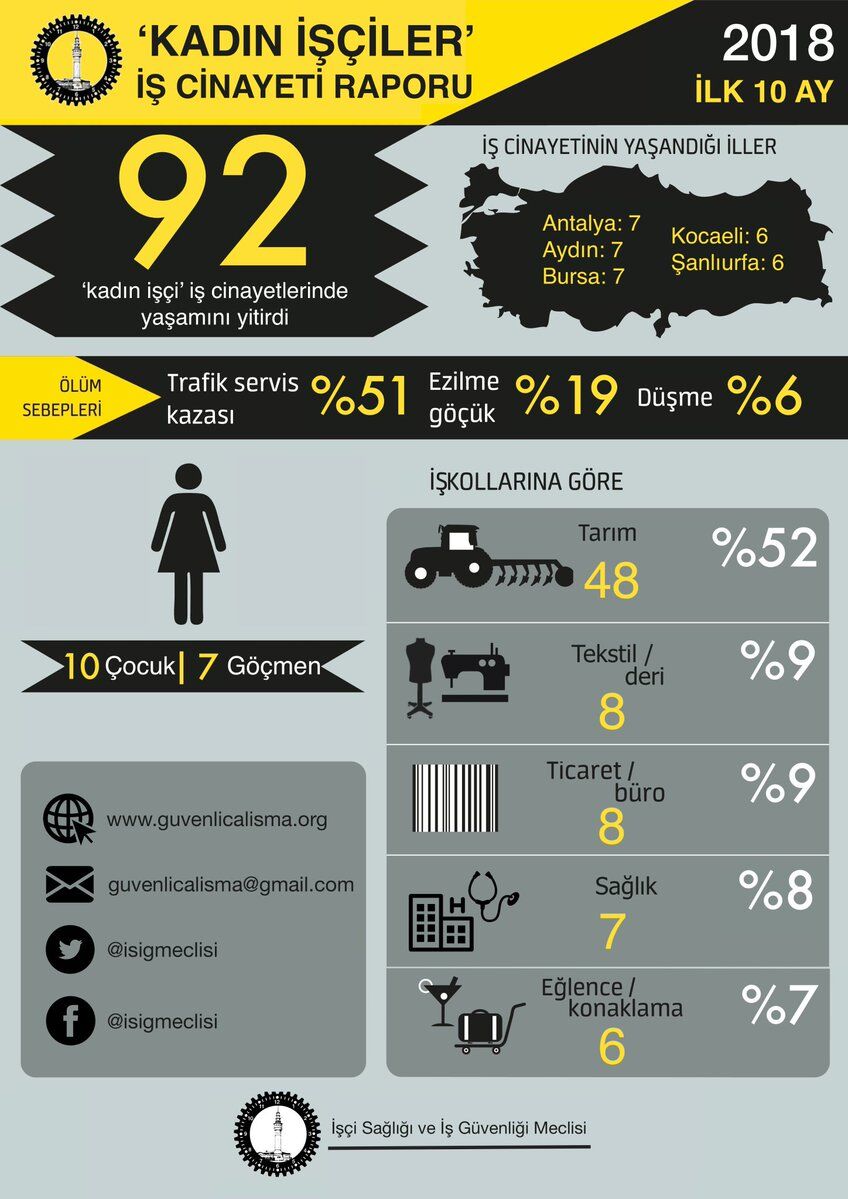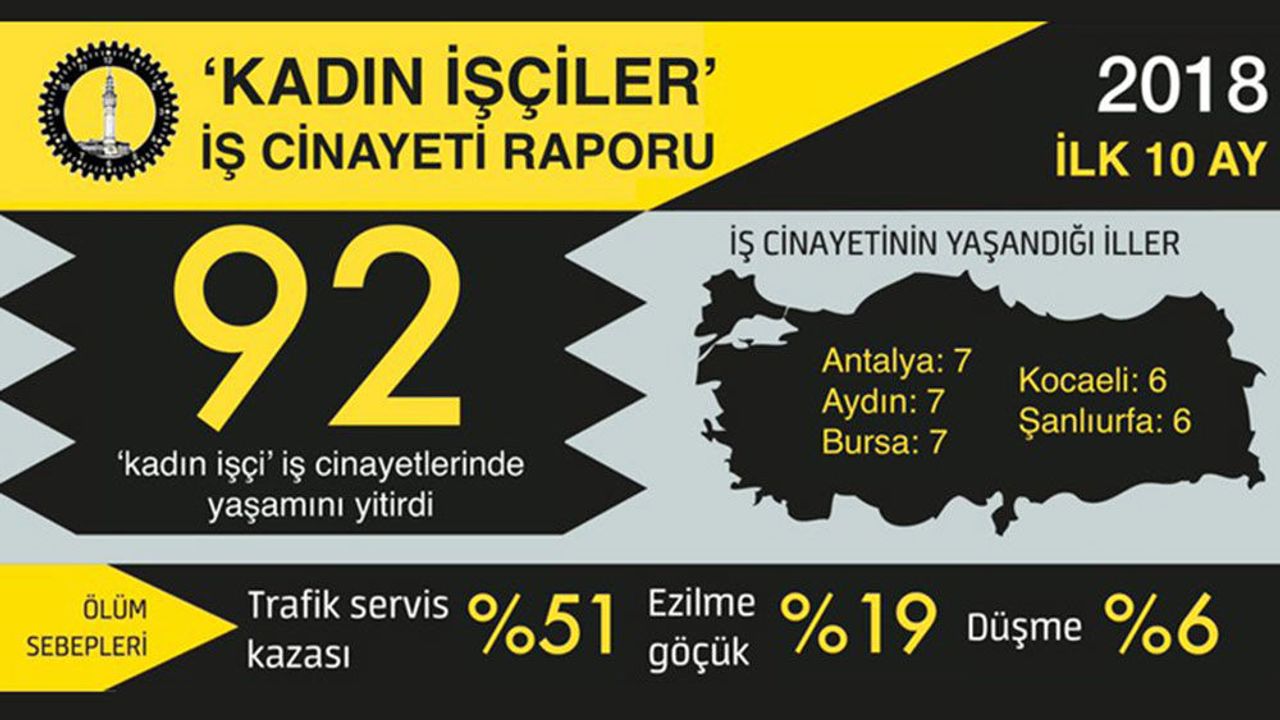 “Kadın iş cinayetleri, kadın emek sömürüsünün ve kadına yönelik şiddetin iş yerinde kadın emekçilerin hayatını nasıl etkilediğini gösteren en somut halidir” denilen raporda, 2018 yılının ilk 10 ayında en az 92 kadının iş cinayetinde yaşamını yitirdiği bilgisi paylaşıldı.