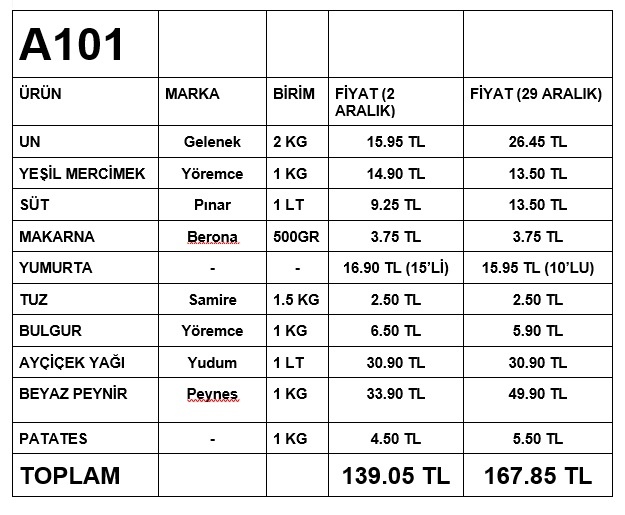 NOT: Bazı tanınmış markalar A101'de satılmadığı için aynı markalarla kıyas yapılamamış, fiyat farkı da buradan kaynaklanmıştır.
